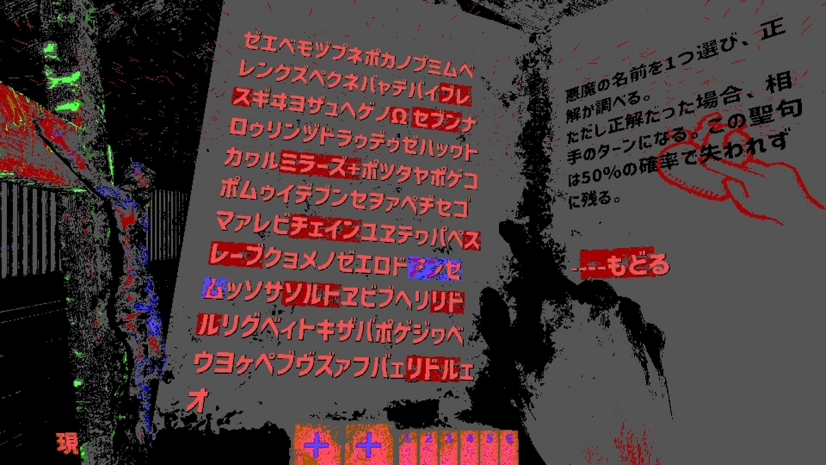 ↑様々な聖句(カード)を駆使して悪魔の名前を当てることで祓魔する。